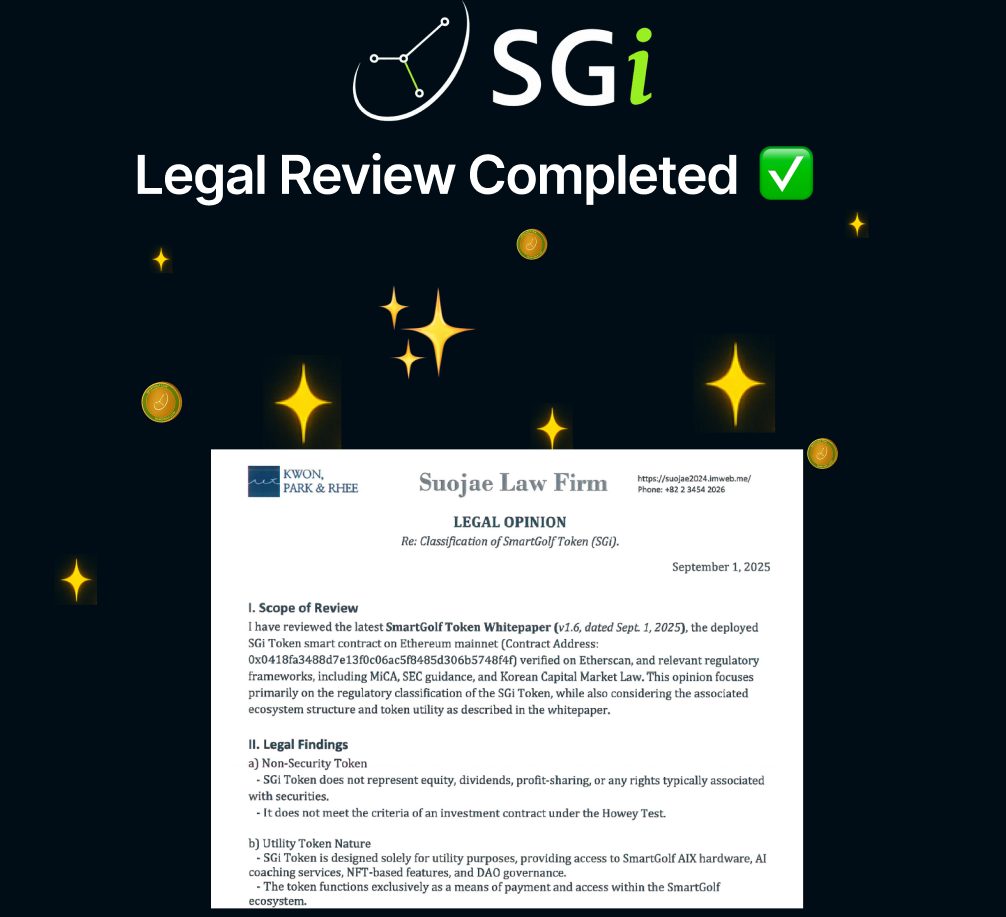 SMARTGOLF Inc. has successfully completed a formal legal review of the SGi Whitepaper and Smart Contract by [Suojae Law Firm].The
